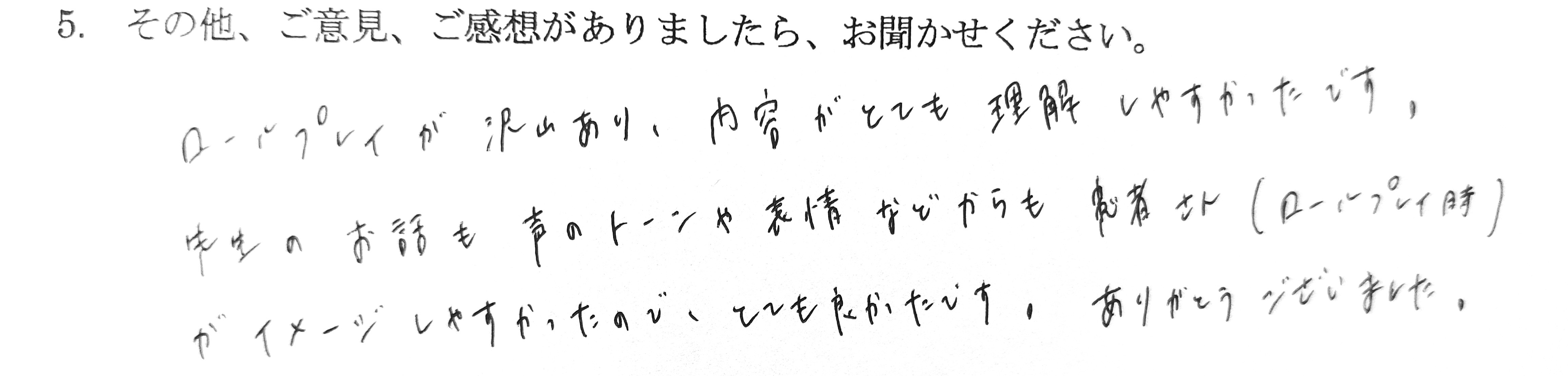 ロールプレイが沢山あり、内容がとても理解しやすかったです。