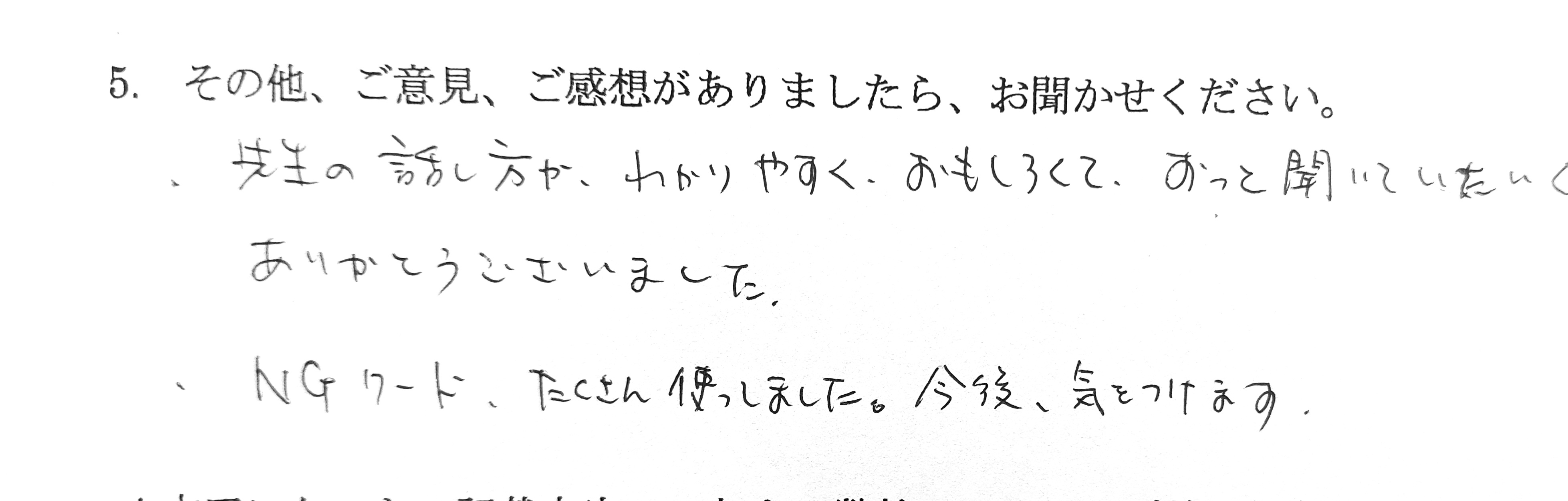 先生の話し方が、わかりやすく、おもしろくて、ずっと聞いていたいくらいでした。ありがとうございました。
