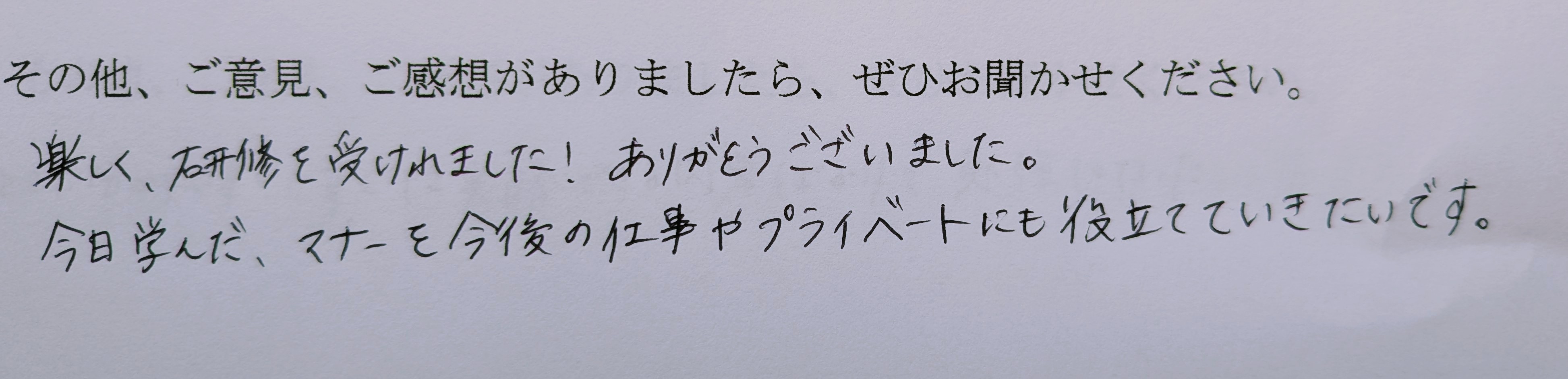 今日学んだ、マナーを今後の仕事やプライベートにも役立てていきたいです。